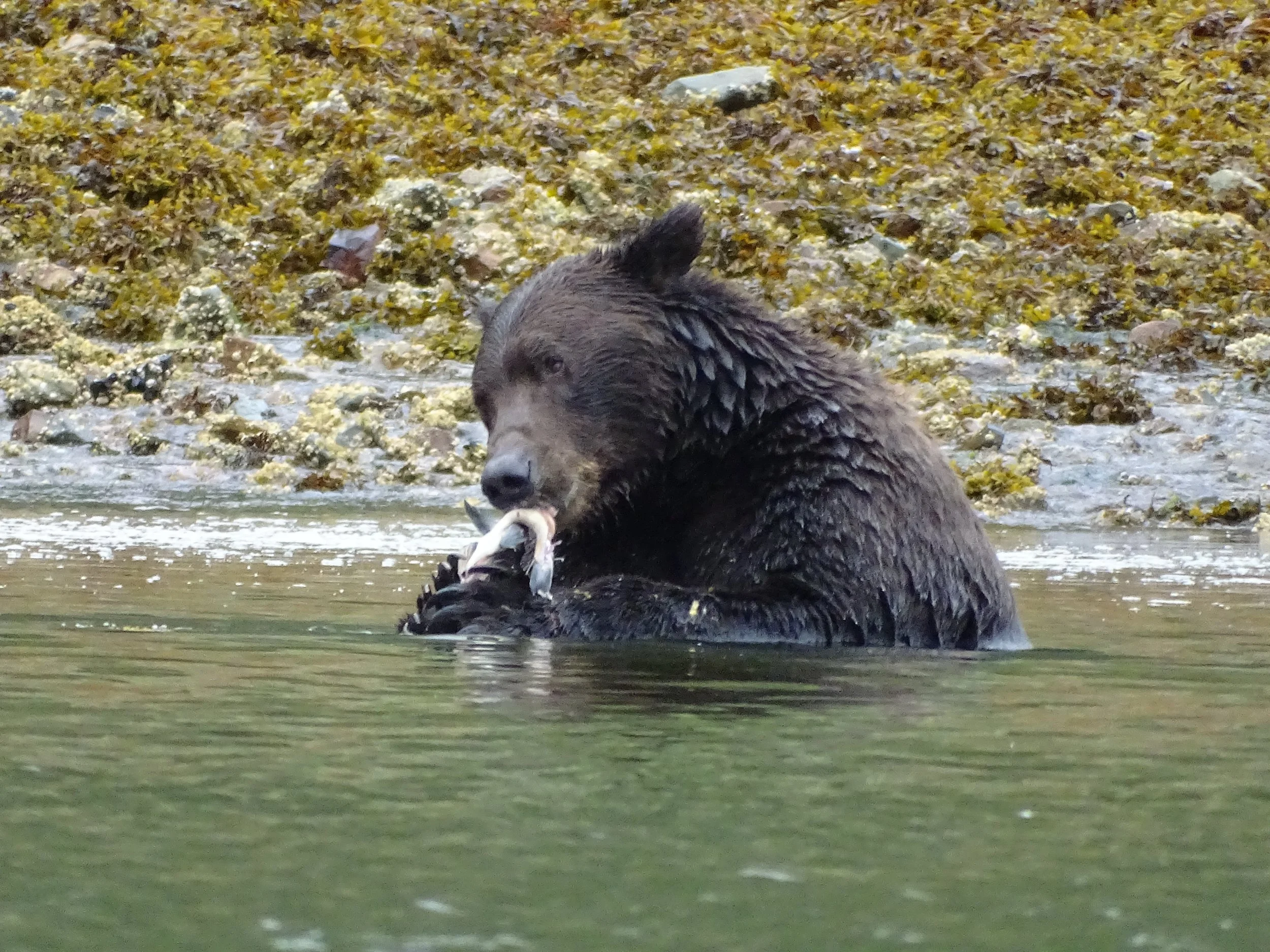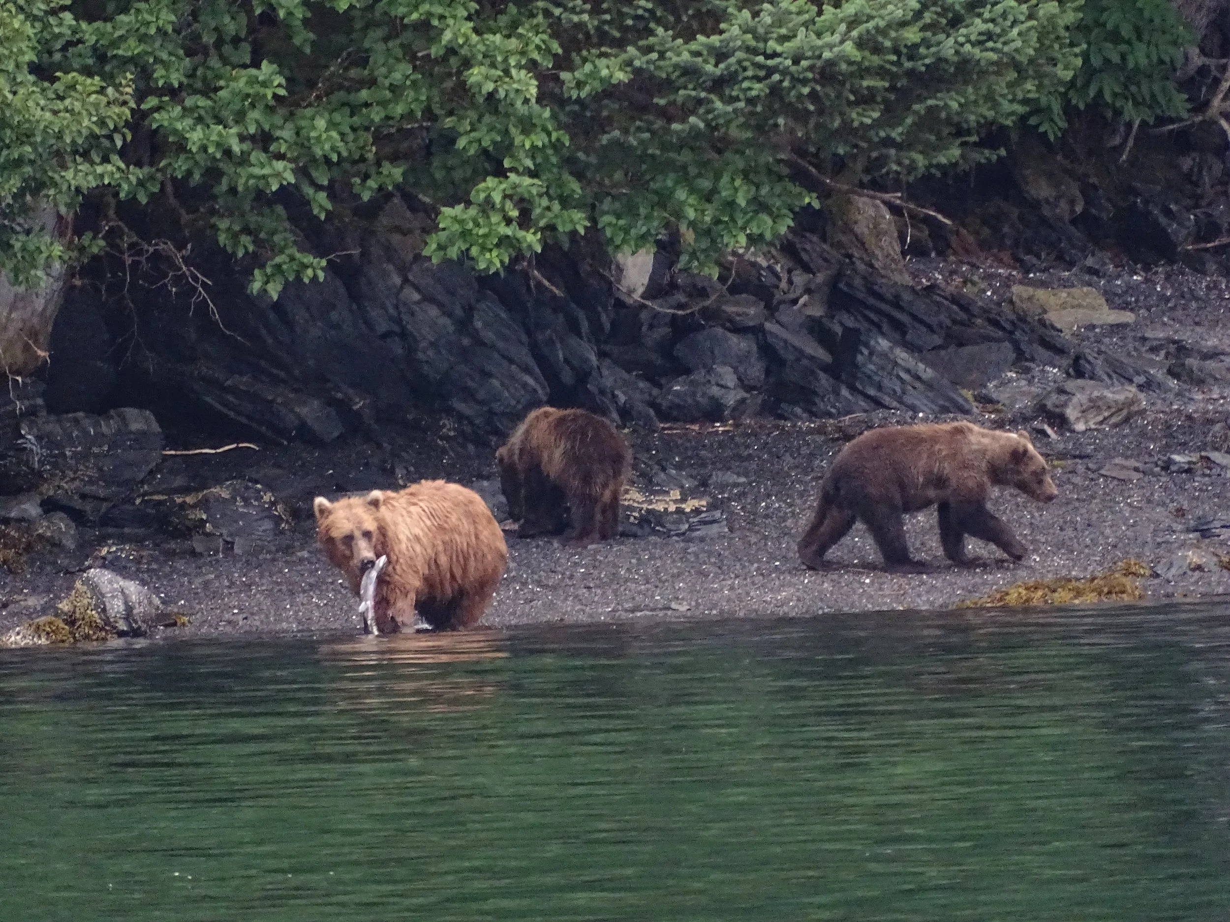 Kodiak Bears, the largest of the brown bears, are abundant on Kodiak, Geographic Harbor, and the surrounding area. As salmon return in the late summer, bears feast at the shoreline. We decided it was better not to venture ashore!